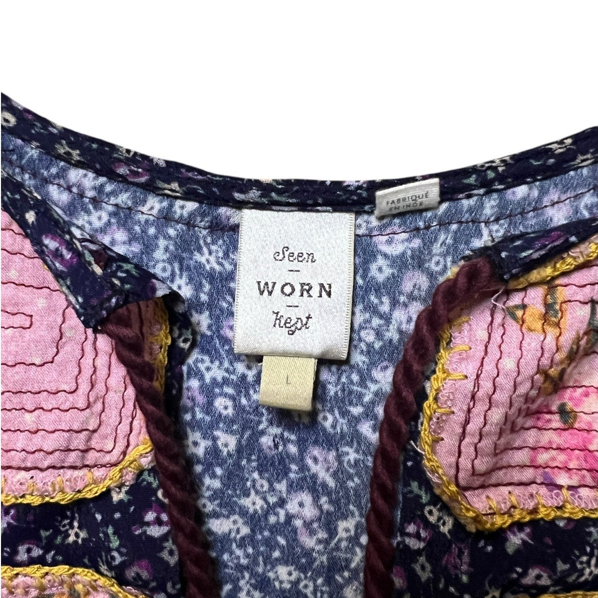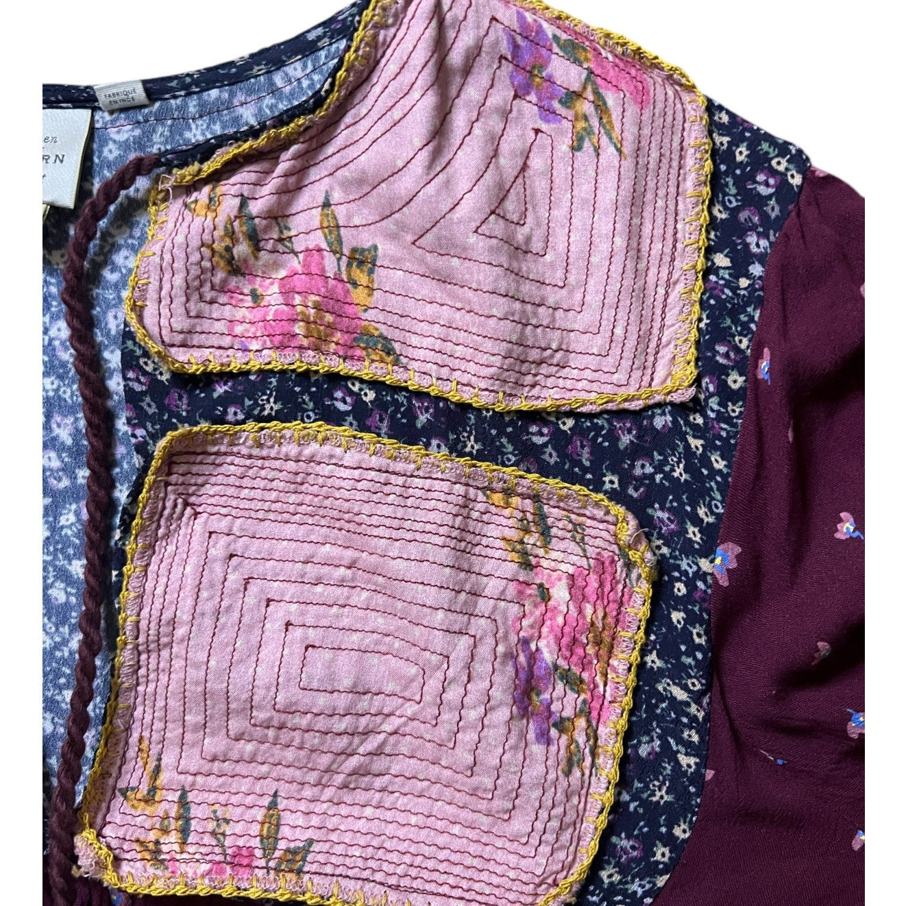 Style: Boho, Long Sleeve, Embroidered Patchwork with Tassel Tie Neck