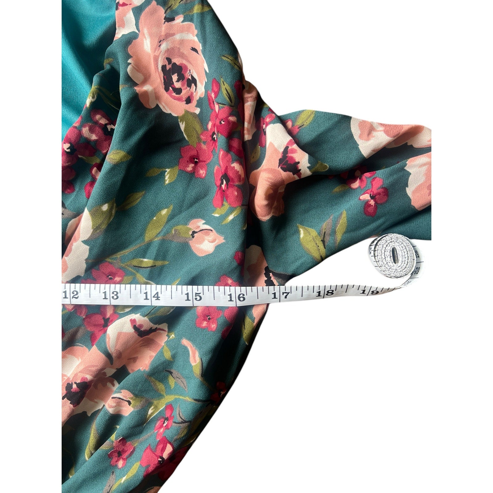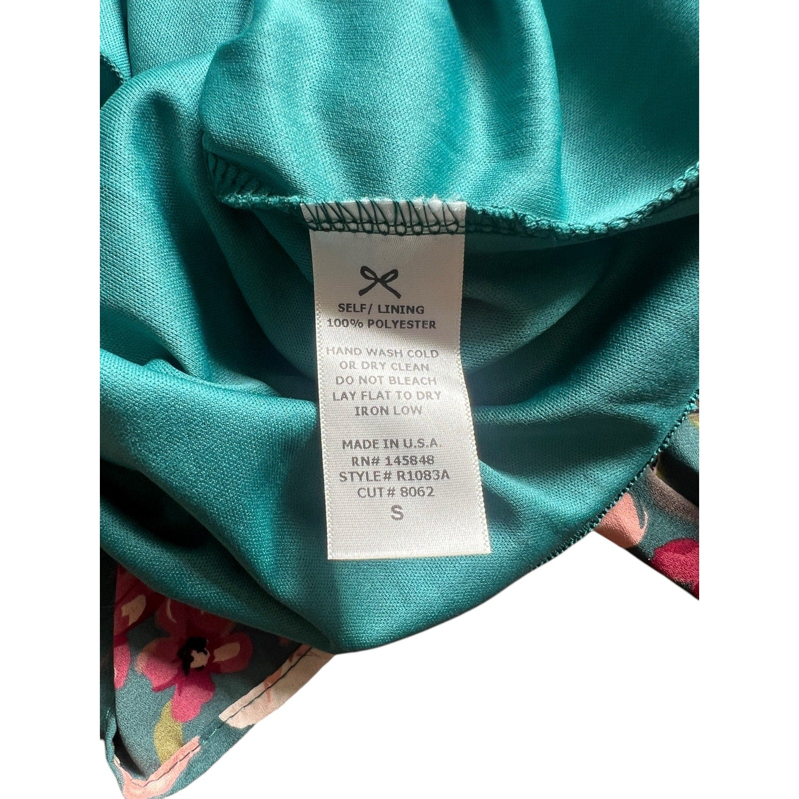 Color: Teal with pink and red floral print