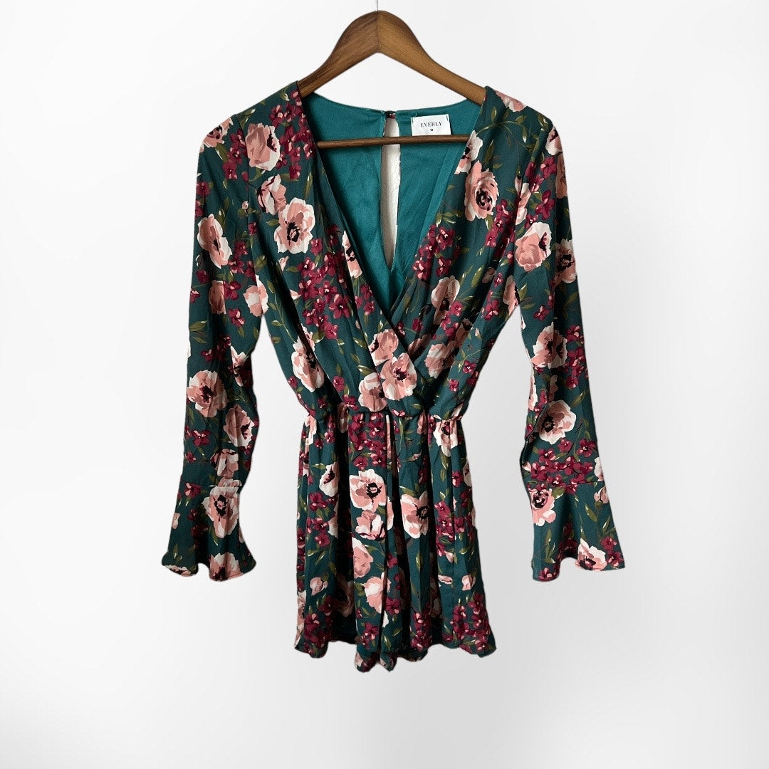 Everly Teal Floral Long Sleeve Romper - Size Small